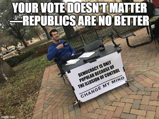 I’m still wrestling with this, but Democracy feels more like smoke and mirrors than anything. Am I right? What am I missing?