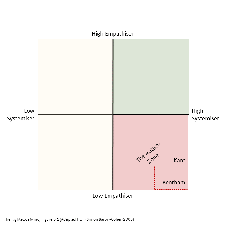 The two axes depict systemising on the X-axis and empathy on the Y-axis. The point he makes (notably anticipating ad hominem charges) is that Bentham would likely be labelled on the autism spectrum as having Asperger’s Syndrome these days and Kant fared only slightly better. Hume, on the other hand—and though not plotted—, would have exhibited more empathy than these other blokes. And empathy had theretofore been mostly absent with moral philosophy to date—notwithstanding Hume. I can only imagine that Haidt would situate himself in the favourable green box.