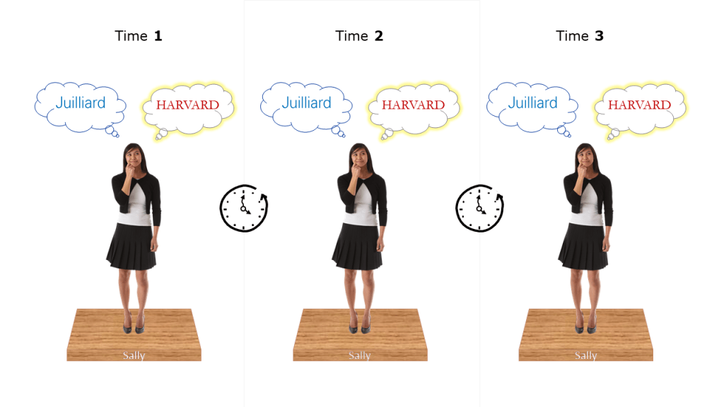 In a deterministic universe, borrowing from Peter van Inwagen’s example, if Sally has to choose between Julliard and Harvard, if she ‘chooses’ Harvard, the first time, and subsequent instance would see her making the same choice.