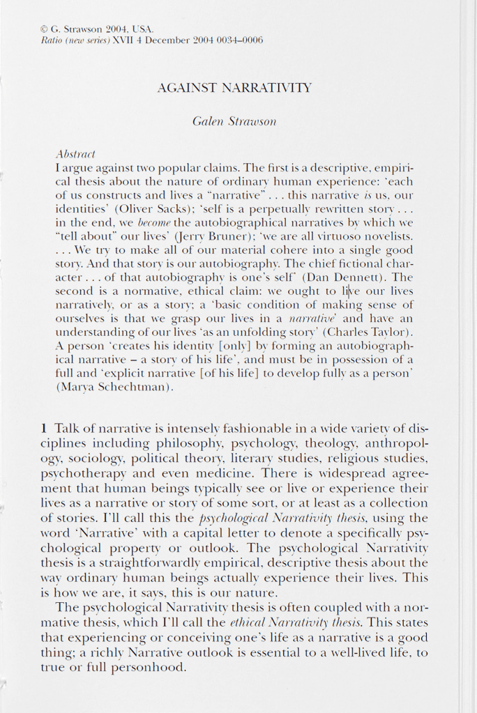Identity is predicated on the notion of the self. I’m partial to Strawson here, but I think I am somewhere in the middle. I understand that the standard narrative is that we construct a narrative to represent our self. This creates a heuristic. But life is not a story.