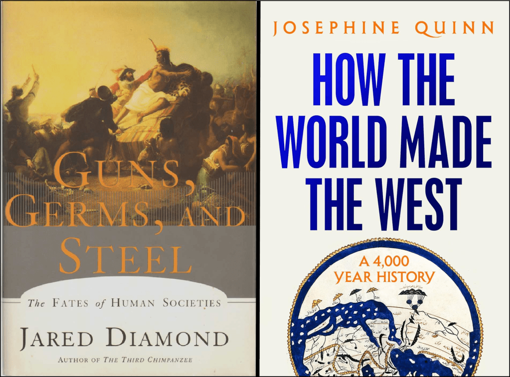 I am reading Jared Diamond’s Guns, Germs, and Steel: The Fates of Human Societies, the first and likely most famous of an informal trilogy. I thought I had already read it, but I think I only saw the PBS show. Having recently finished Josephine Quinn’s How the World Made the West, I wanted to revisit this perspective. The two books are presented in different styles and represent different perspectives, but they seem to be complementary.
