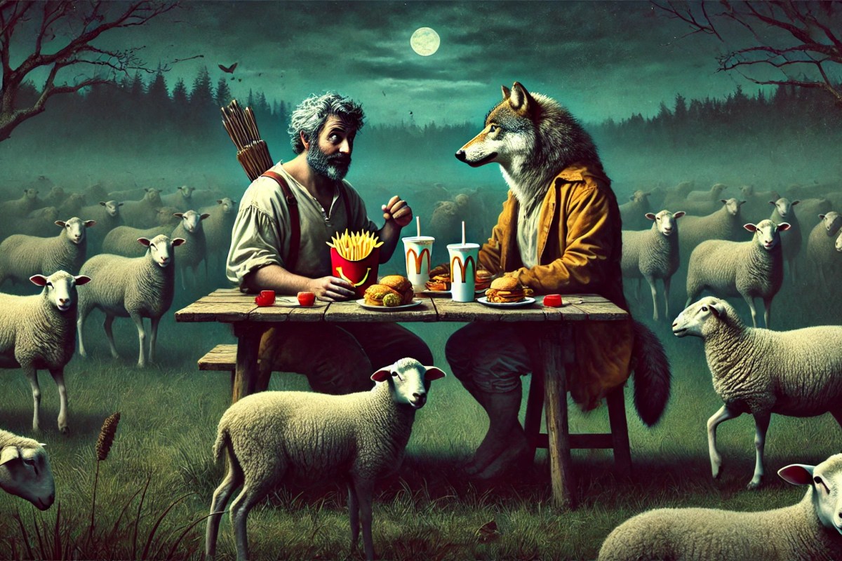 A hungry wolf, tired of dodging vigilant shepherds, decides to forgo subterfuge altogether. He waltzes into the flock, making no effort to hide his predatory nature. A naïve lamb follows him, and predictably, the wolf claims his meal. Later, the wolf returns to the sheepfold, where the shepherd — instead of protecting his flock — teams up with the wolf. Together, they butcher a sheep before abandoning the scene entirely to indulge in McDonald’s, leaving the traumatised sheep to accept their grim new reality.