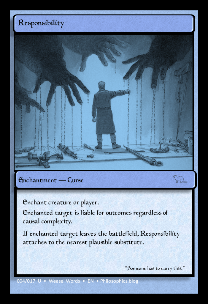 By the time punishment enters the picture, “responsibility” has quietly become something else entirely: the moral right to retaliate without guilt.