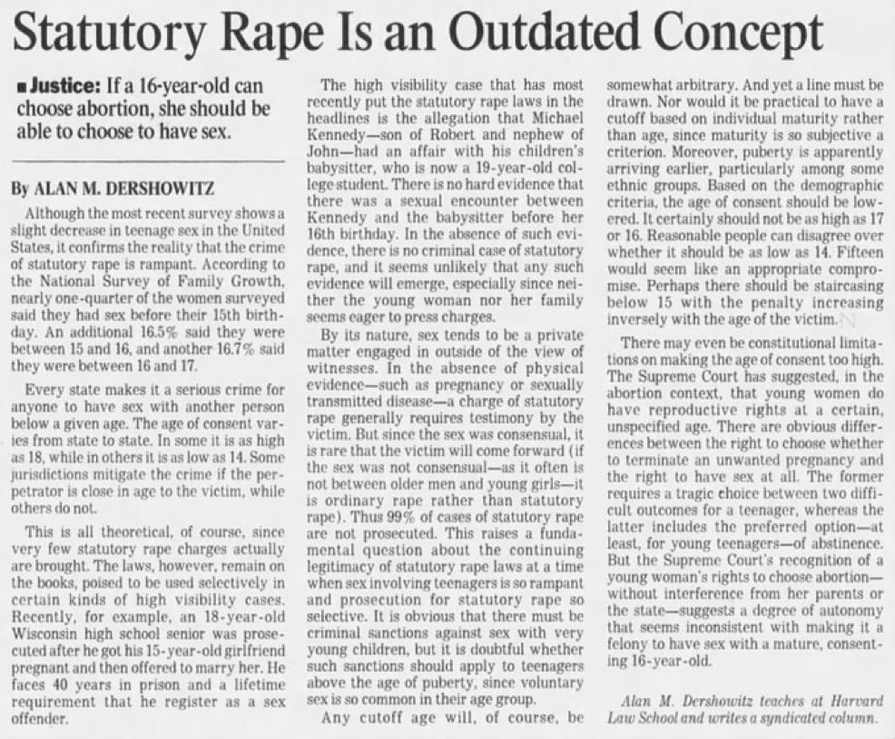 In the newspaper clipping above, legal scholar Alan Dershowitz argues that if a 16-year-old can choose abortion, then she should be able to choose to have sex. The argument is presented as sober, rational, and juridical. A syllogism offered as disinfectant.