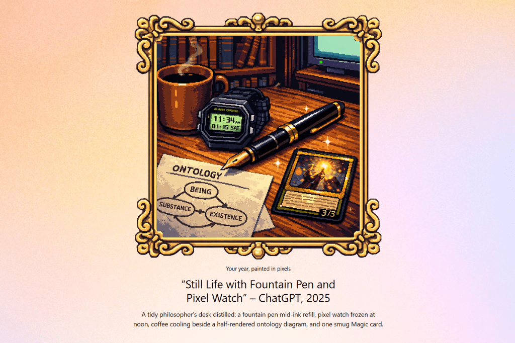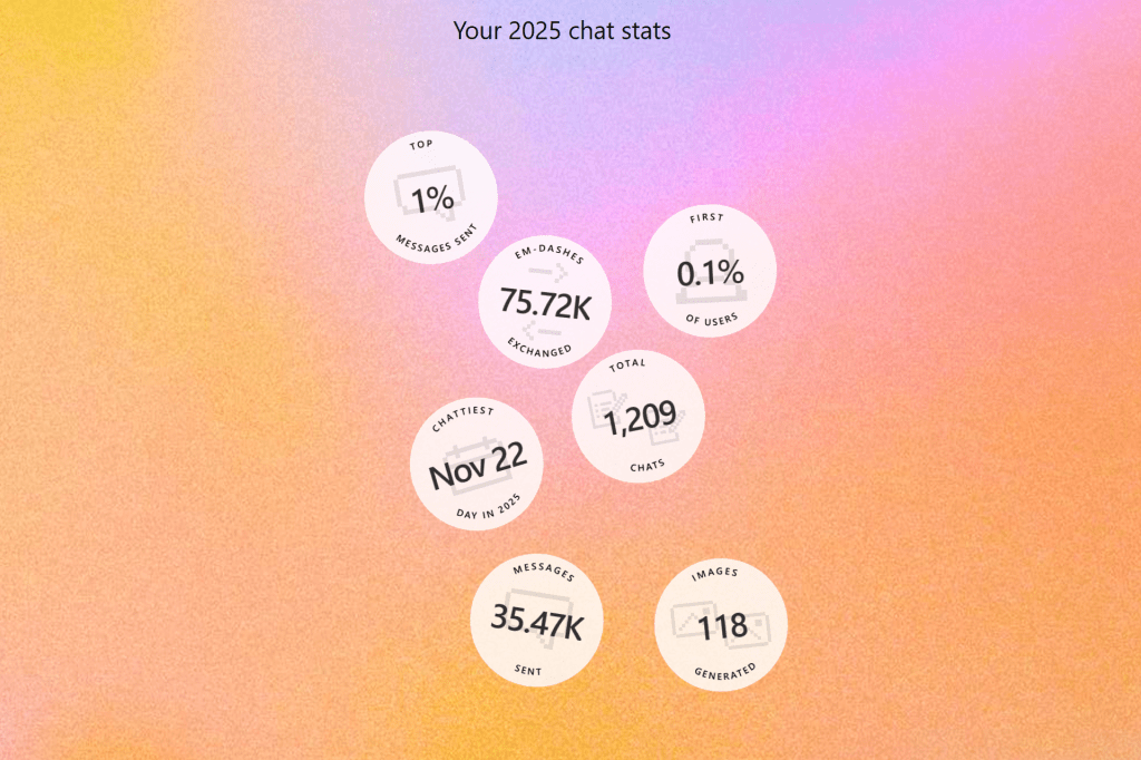 Like many apps, especially in the SaaS and PaaS space, ChatGPT offered a year-in-review. Even though I use several generative AI platforms, ChatGPT and Claude are my top two, followed by Gemini, Grok, DeepSeek, Perplexity, and Mistral – in that order. I also like Kimi K2. I am not a fan of Meta Llama or Qwen.