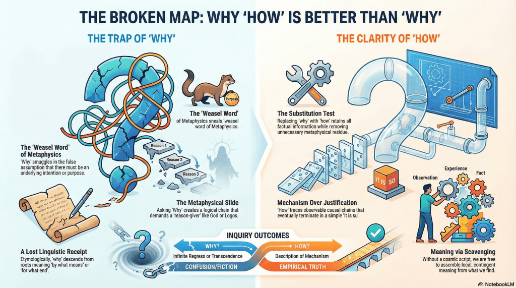 Any genuine informational “why” question can be reformulated as a “how” question without losing explanatory power. What disappears is not content but metaphysical residue.
