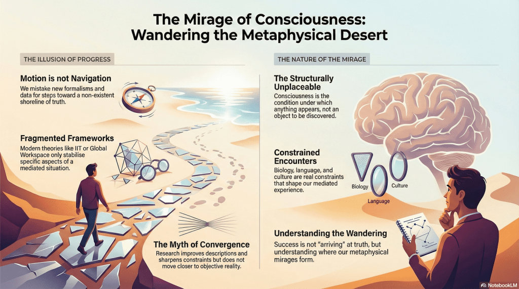 Modern theories of consciousness oscillate because they are stabilising different aspects of the same mediated situation. IIT formalises integration. Global workspace models privilege broadcast. Predictive processing foregrounds inference. Illusionism denies the furniture altogether. Each feels solid while inhabited. Each generates the same phenomenology of arrival: now we finally see what consciousness really is.
