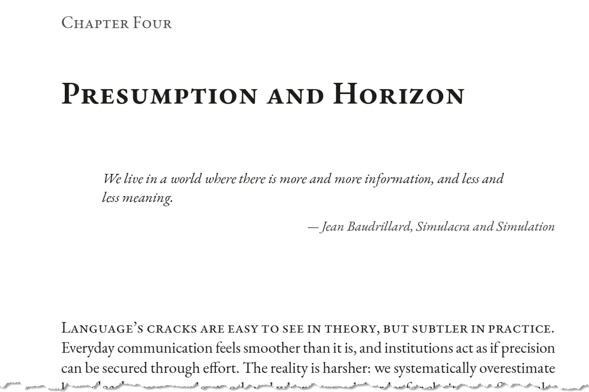 In short, I discuss where language fails in law, politics, science, and digital culture, where we think language conveys more than it does.