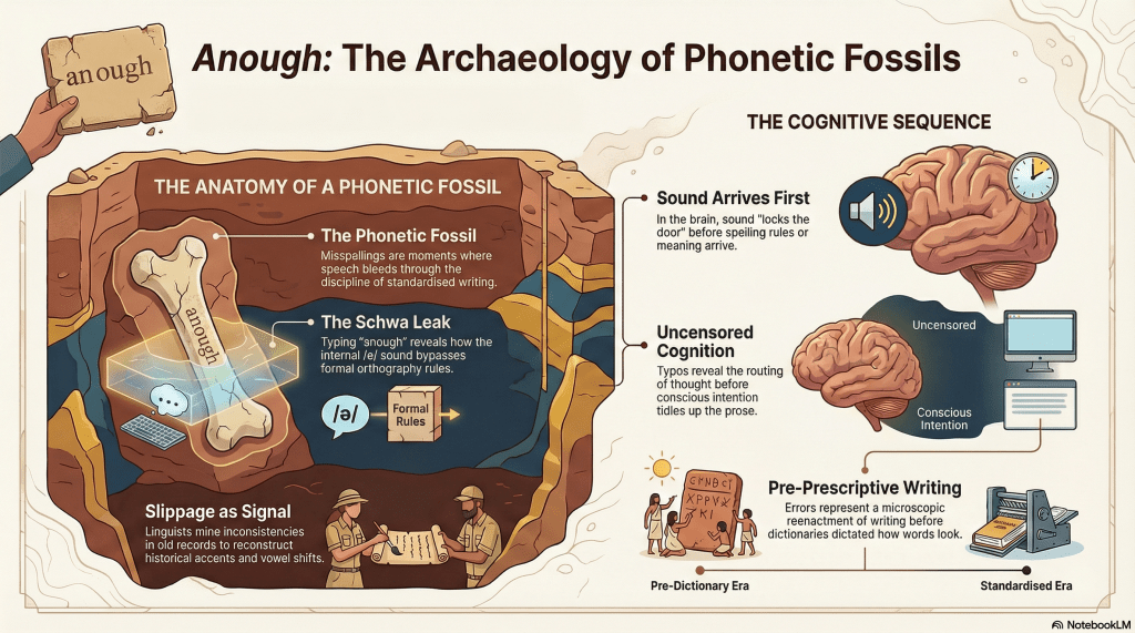 Anough belongs to this lineage. It’s a microscopic reenactment of pre-standardised writing, occurring inside a modern, over-educated skull with autocorrect turned off. For a brief moment, sound outranks convention. Orthography lags. Then the editor arrives, appalled, to tidy things up.
