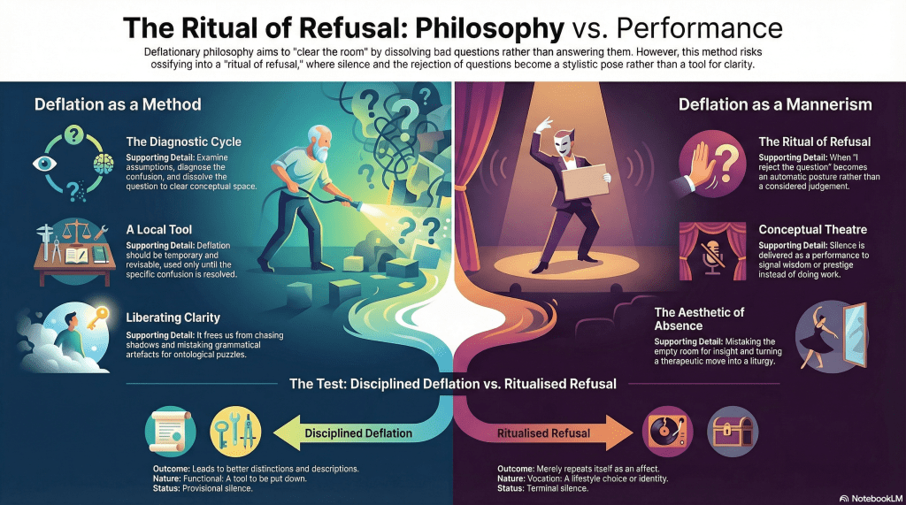 When ‘I reject the question’ becomes a default response rather than a considered judgement, deflation has slipped from method into mannerism. The absence of claims becomes a badge. The lack of commitments becomes an identity. One is no longer clearing space, but occupying emptiness.