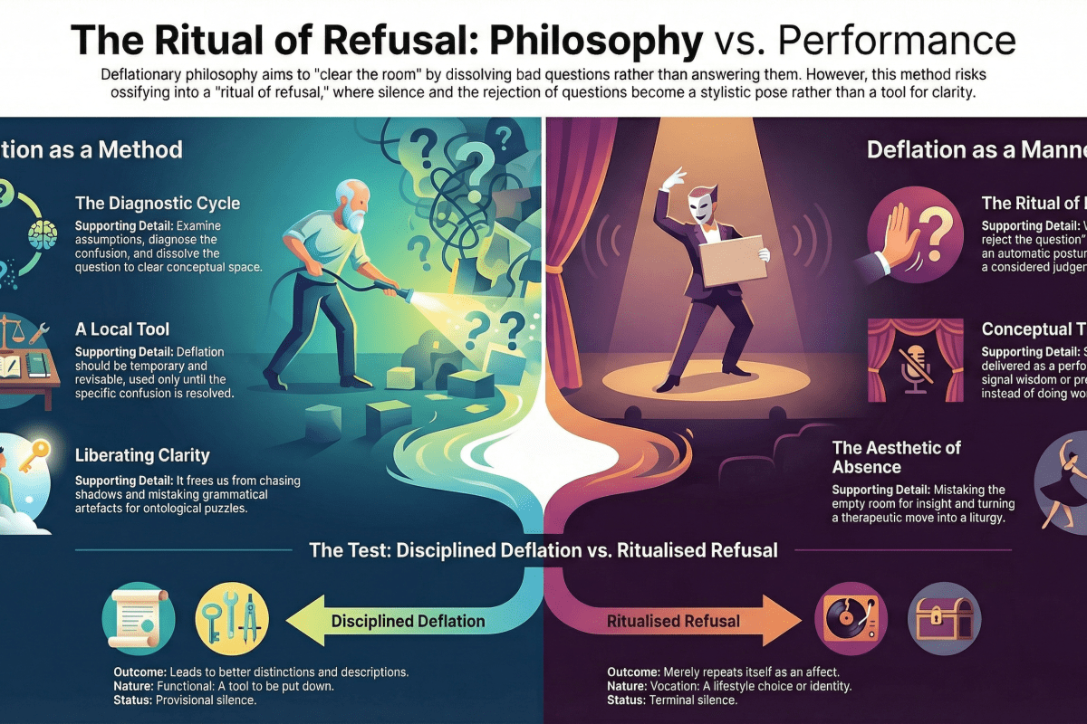 When ‘I reject the question’ becomes a default response rather than a considered judgement, deflation has slipped from method into mannerism. The absence of claims becomes a badge. The lack of commitments becomes an identity. One is no longer clearing space, but occupying emptiness.
