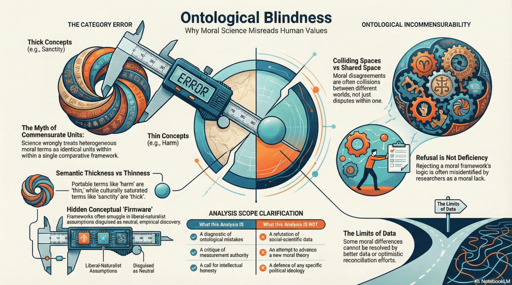 Ontological Blindness in Modern Moral Science is a working title with a working subtitle as The Why Semantic Thickness, Measurement, and Reconciliation Go Wrong. No spoilers.