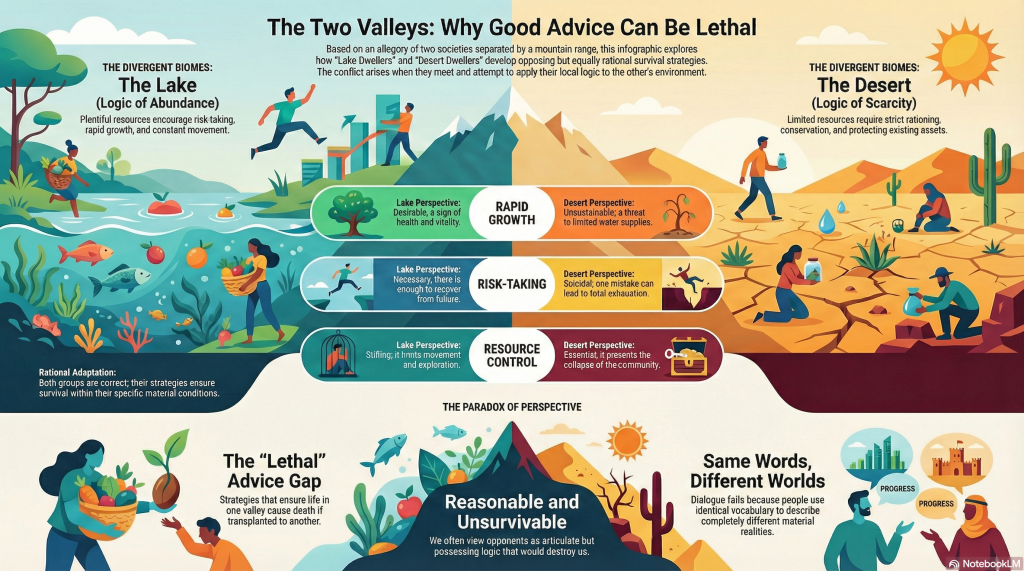 If the desert people adopted lake-logic—explore freely, trust abundance, move without restraint—they would exhaust their resources in a context where resources are the whole point.