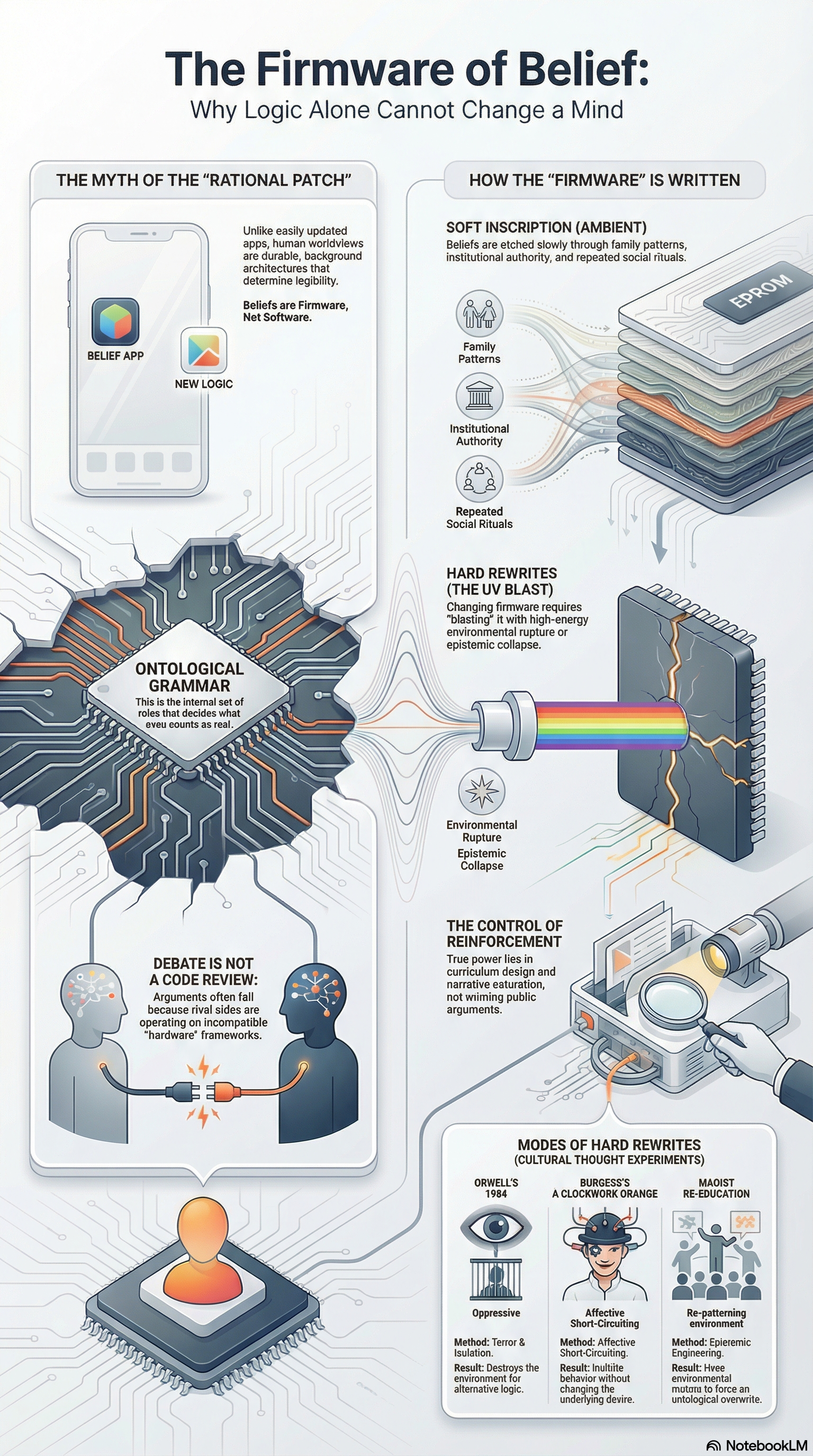 EPROM — erasable programmable read-only memory — can, in theory, be rewritten. But not casually. It requires exposure to high-energy ultraviolet light. You do not “reason” an EPROM into new content. You blast it.