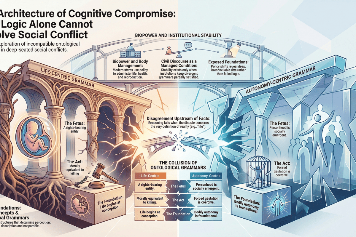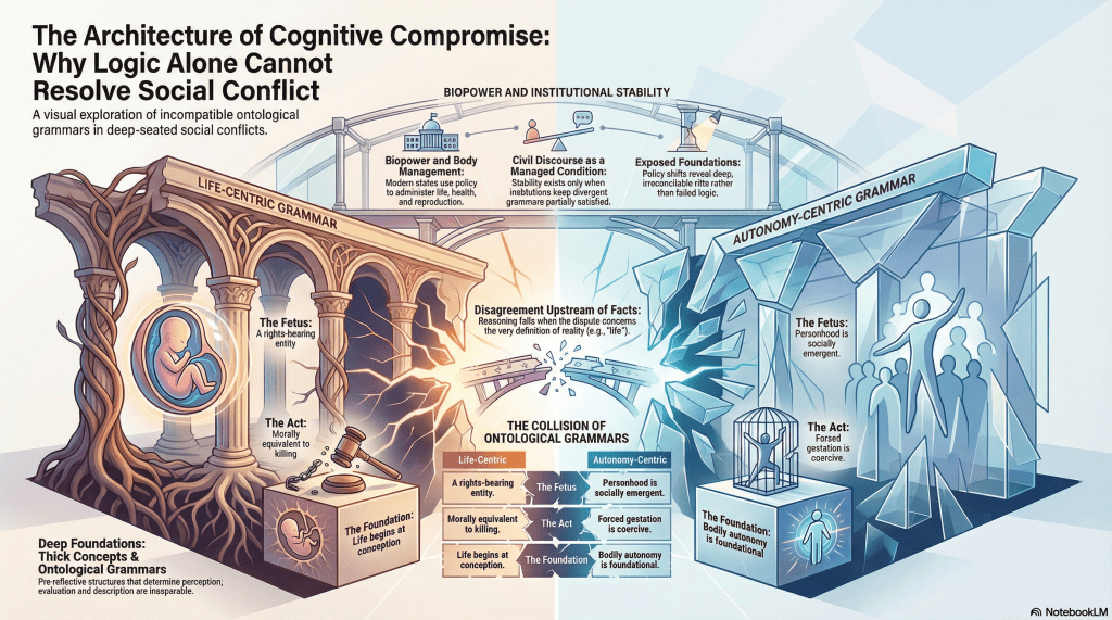 Liberal Enlightenment optimism assumes that if disagreement persists, more information, better reasoning, or improved empathy will close the gap. But if the dispute concerns the very ontology of ‘life’, ‘person’, or ‘rights’, no amount of fact-sharing resolves the issue. The disagreement is upstream of facts.