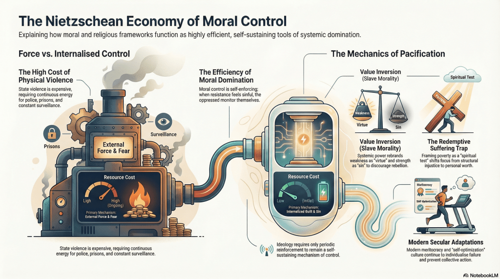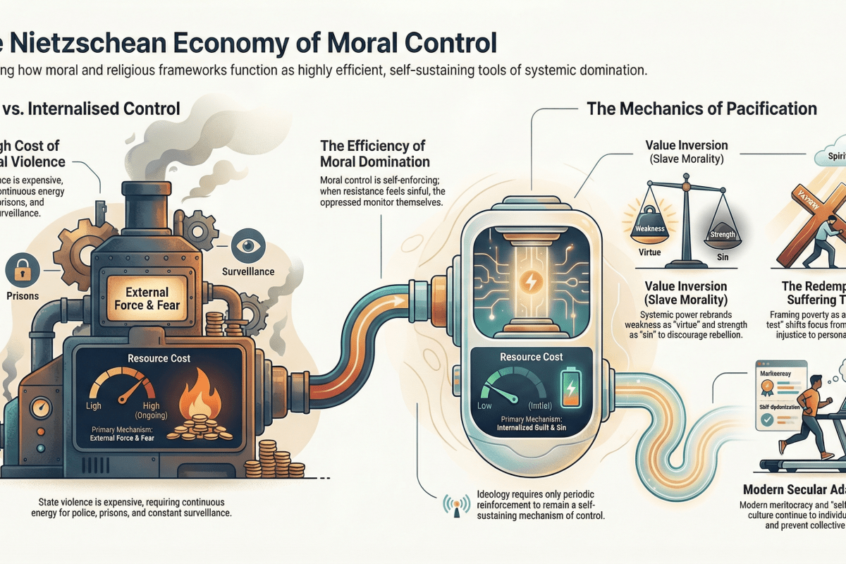 Synthesized Nietzschean morality framework into systemic control mechanisms