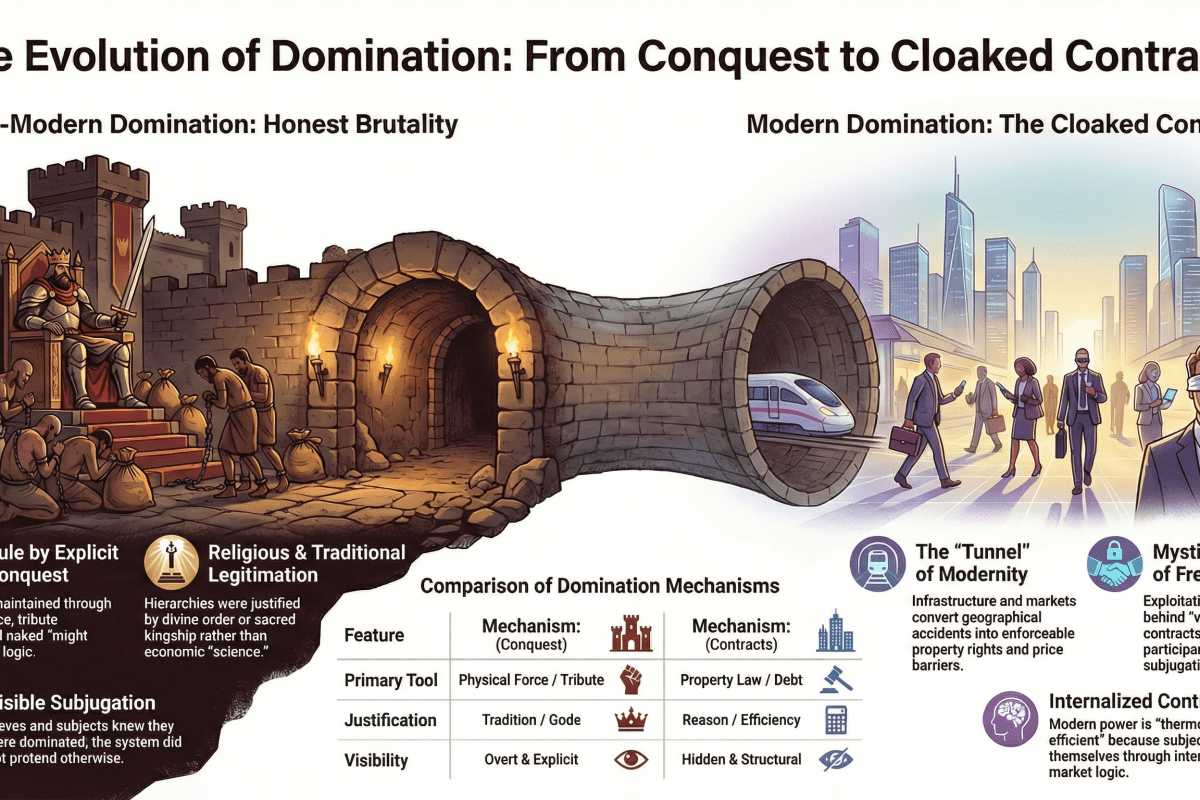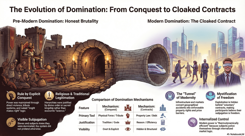 It’s saying: Yes, pre-modern societies had domination. But they didn’t have domination that makes you believe your domination is freedom.