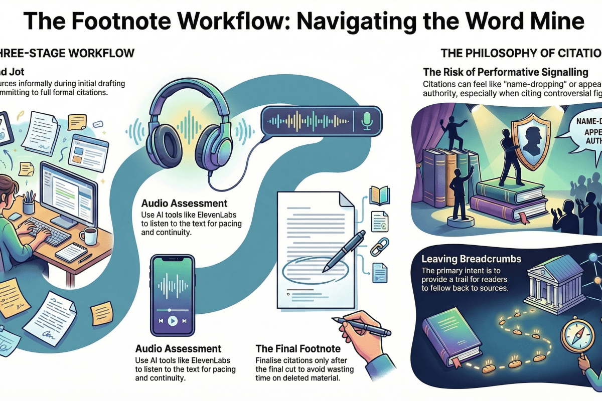 When I write, I tend to jot down sources and references as I go, but I leave the footnoting until the final revision. There is little point in spending time drafting footnotes for material that may not survive the cut. So here I am, drafting footnotes.