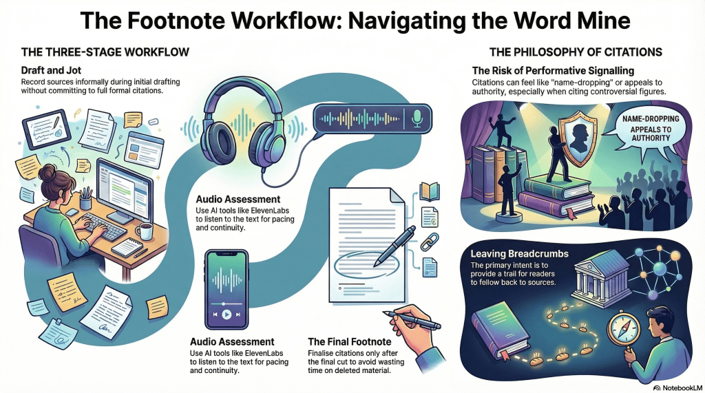 I am of two minds about footnotes and citations, especially in academic work. On the one hand, they can feel performative, a way of signalling that one has incorporated so-and-so, a kind of name-dropping appeal to authority. As a heterodox writer, this is risky anyway, because I am liable to cite one of the approved villains. God forbid a Nietzsche, a Heidegger, or a Foucault. Analytic philosophers, in my experience, can be remarkably thin-skinned.