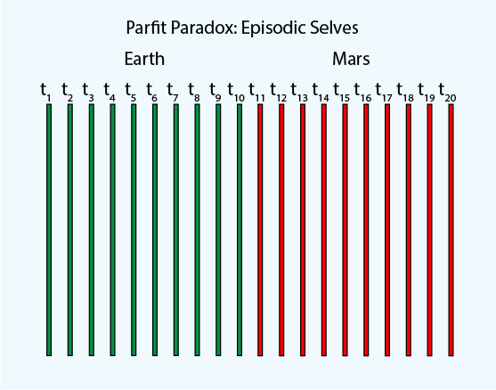 A thought experiment by Derek Parfit, here’s the setup: ostensibly, a human is cloned, but they aren’t so much cloned as teleported to Mars, à la Star Trek – there, not here, particle by particle.