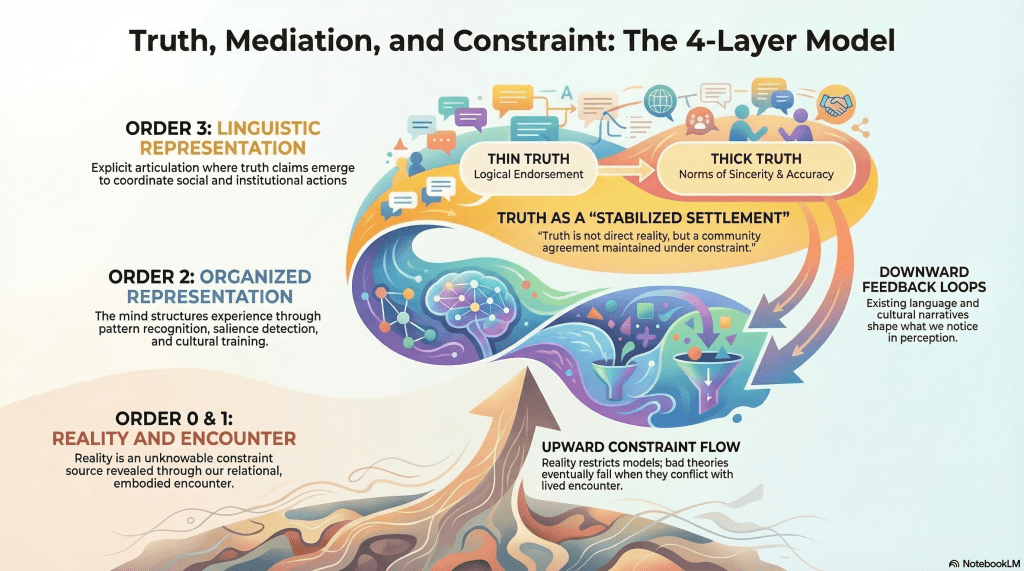 It is the provisional stabilisation of claims within mediated encounter, negotiated through language, rhetoric, and institutions, and continually tested against a world that never fully yields to our descriptions. We don’t discover Truth with a capital T. We negotiate survivable descriptions under pressure.