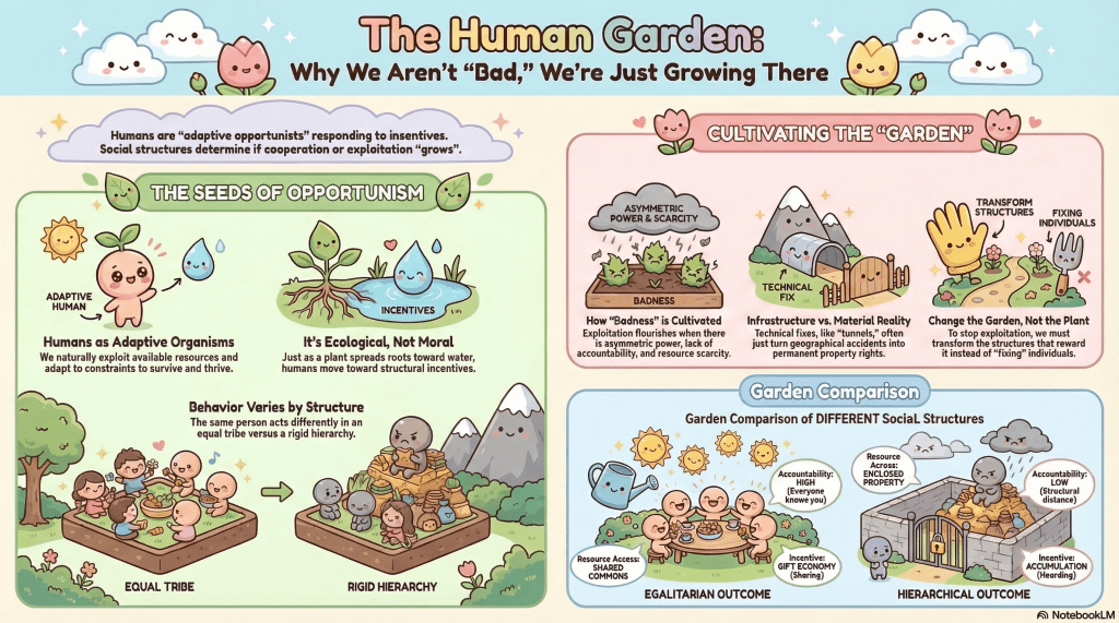 The evil—if we must use that word—is in the structures that make exploitation optimal, domination rational, and resistance costly.