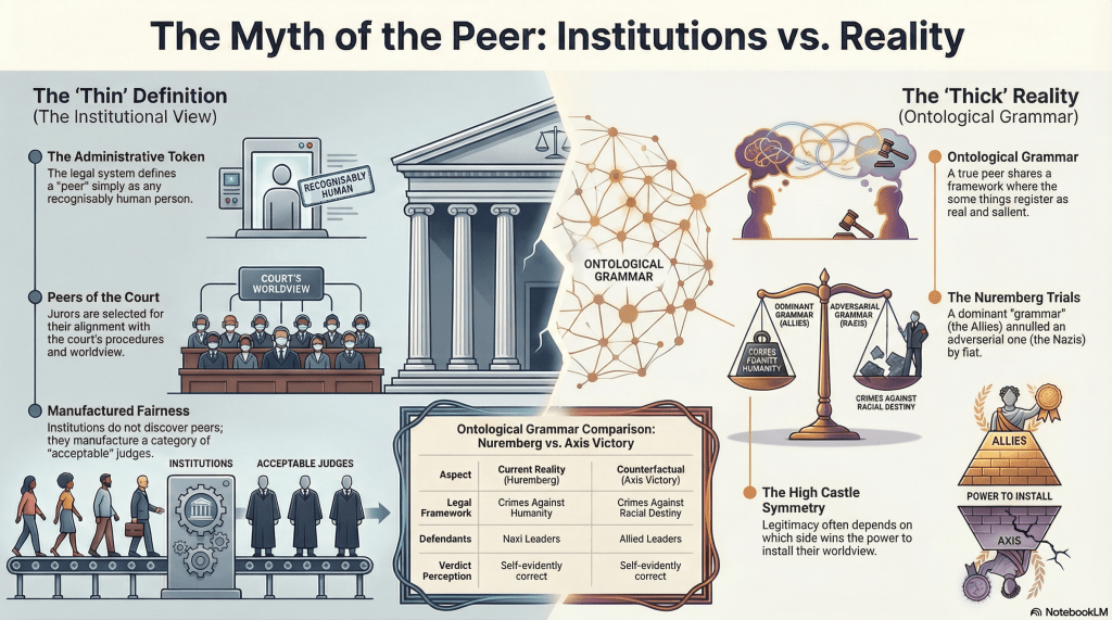 This case should be obvious. The peers here are precisely not their peers, but adversaries. The defendants were not tried by those who shared their grammar of legitimacy, history, necessity, authority, or even the relevant category boundaries. They were tried by agents operating within a rival grammar – one that had already classified the defendants’ framework not as a competing ontology, but as criminal pathology.