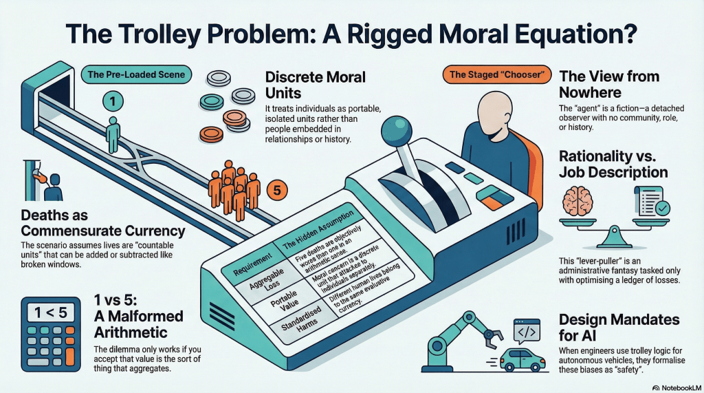 It’s one thing to say that trolley problems are structured rather than neutral. Most thought experiments are structured. Simplification is the point. The real indictment isn’t that the trolley case has assumptions, but that it has these assumptions – and that they are not universal features of moral reasoning but the inherited furniture of a very particular intellectual tradition.