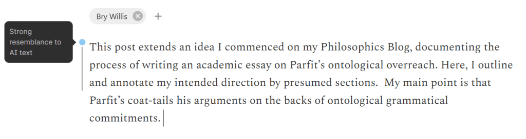 This post extends an idea I commenced on my Philosophics Blog, documenting the process of writing an academic essay on Parfit’s ontological overreach. Here, I outline and annotate my intended direction by presumed sections. My main point is that Parfit’s coat-tails his arguments on the backs of ontological grammatical commitments.