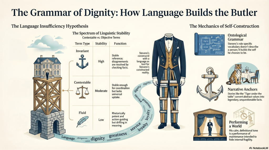 Take butler itself. In ordinary usage, it looks occupationally concrete – a person who does a particular job. But in Stevens’s mouth, it stops being a role descriptor and becomes a bearer of metaphysical vocation. The word accrues civilisational mythology, evaluative freight, quasi-sacred weight, until it no longer refers to a man who answers a door but to a figure who embodies an entire moral cosmology. That is a lot for a job title to carry, and the weight does not come from the world. It comes from the grammar.
