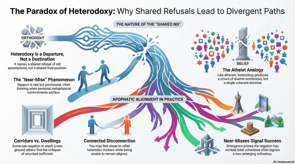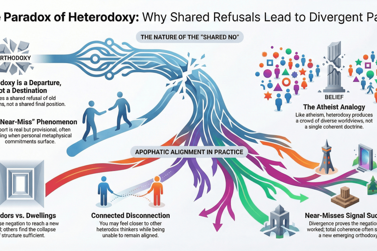 Heterodox work functions less like a manifesto and more like a sorting mechanism. It attracts those whose exclusion criteria overlap with yours and repels those who need different closures. That is not a defect. It is what apophatic alignment looks like in practice. If a heterodox space ever achieves total coherence, it has likely ceased to be heterodox and begun, quietly, to rebuild a doctrine.