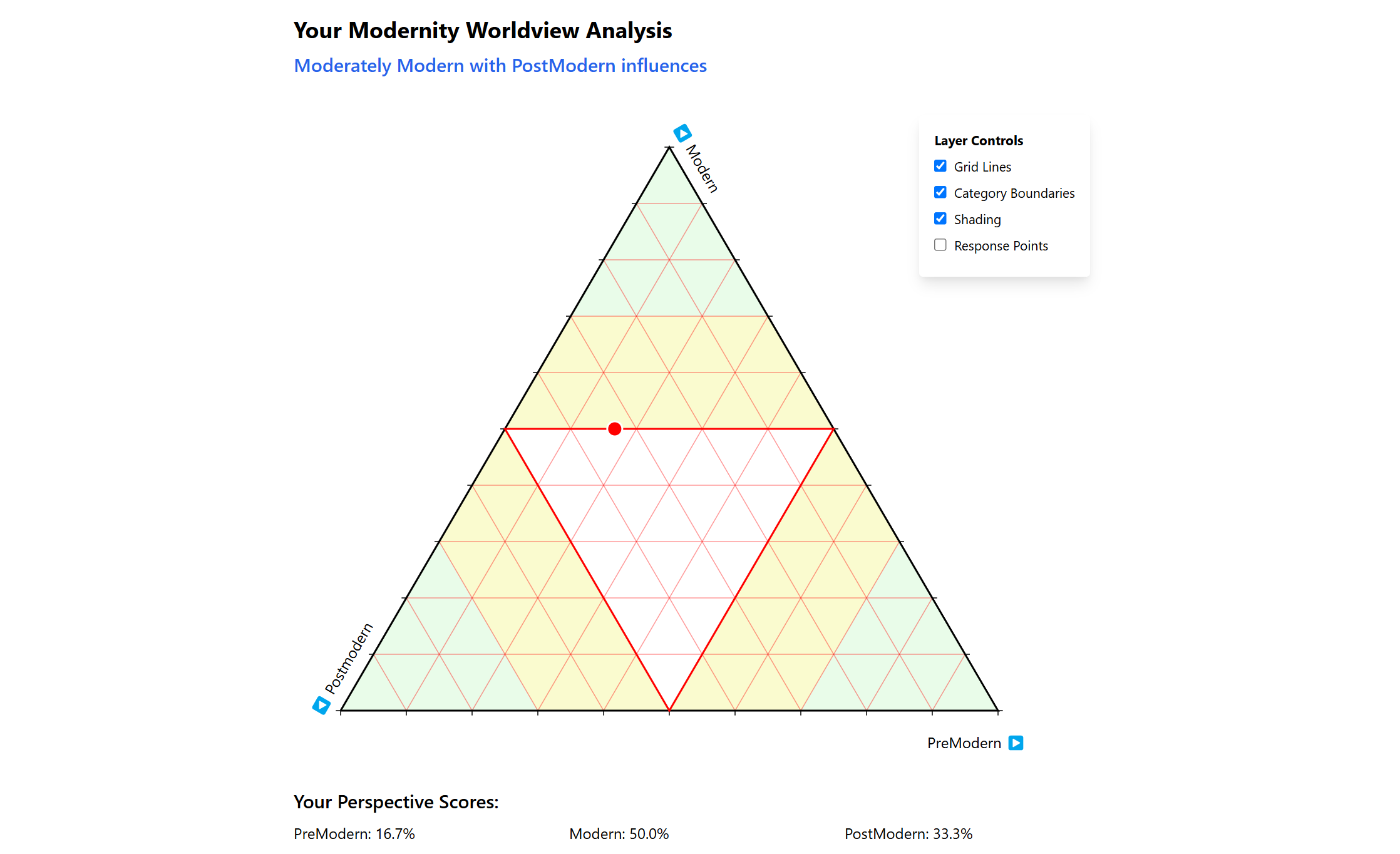 The Modernity Worldview Survey was a tool used to assess an individual’s perspective on modernity. NB: This survey had been hosted at https://modernity-worldview.uc.r.appspot.com/ but is no longer active as of 28/4/2025. It may be reinstated in the future. Thanks to all who participated. Through six carefully crafted questions, this non-judgmental survey illustrates the degree to … Continue reading Modernity Worldview