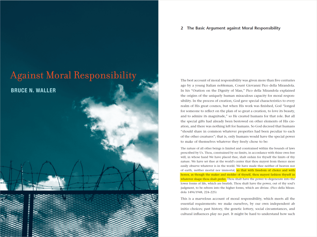 Standard Frankfort examples are referenced as well as Locke. Here he wants to point out regulative control—but he skirts the question of where the volition comes from by saying ‘for his own reasons‘, as if these reasons are somehow meaningful. In the end, he recites the scenarios, performs some hand-waving, and summons his accord with Robert Kane’s “dual voluntariness” constraint on moral responsibility.