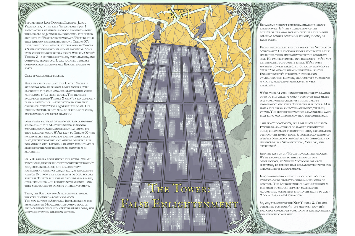 Here we are in 2025, and the United States is stumbling toward its own Lost Decades, still clutching the same managerial catechism while pretending it’s a fresh gospel. The promised evolution beyond Theory X wasn’t a revolution – it was a pantomime. Participation was the new obedience; ‘trust’ was a quarterly slogan. The experiment failed not because it couldn’t work, but because it was never meant to.