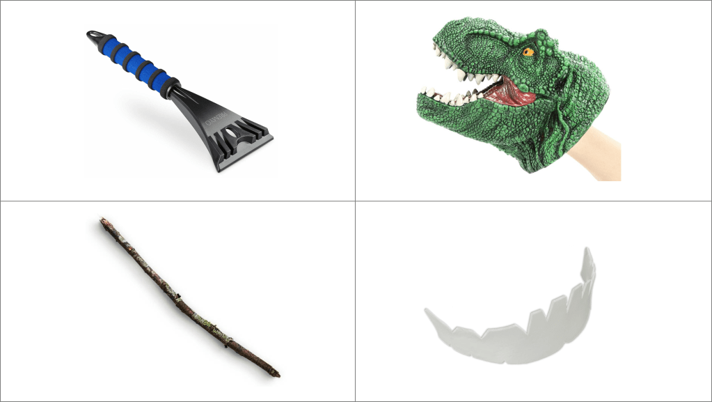 But, you are thinking, these other things not only don’t roar, but they’re also inanimate. Sure, you tell yourself, the dinosaur is a puppet, but you can envisage the connexion. That’s a toy dinosaur, but these other things are an ice scraper, a stick, and who knows what that last thing is? It’s a hat shaper. It was an insert to a cap—like a baseball cap or trucker cap. It was removed for the cap to be wearable, and the insert is one of her favourite toys. All of these rank high on her list of preferred toys.