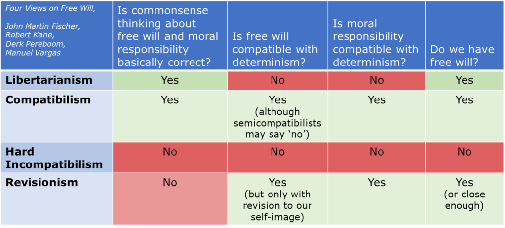 Reading Four Views on Free Will. In the introduction are some guiding definitions as well as this chart to help one to understand various views (row-wise) based on some questions (column-wise).