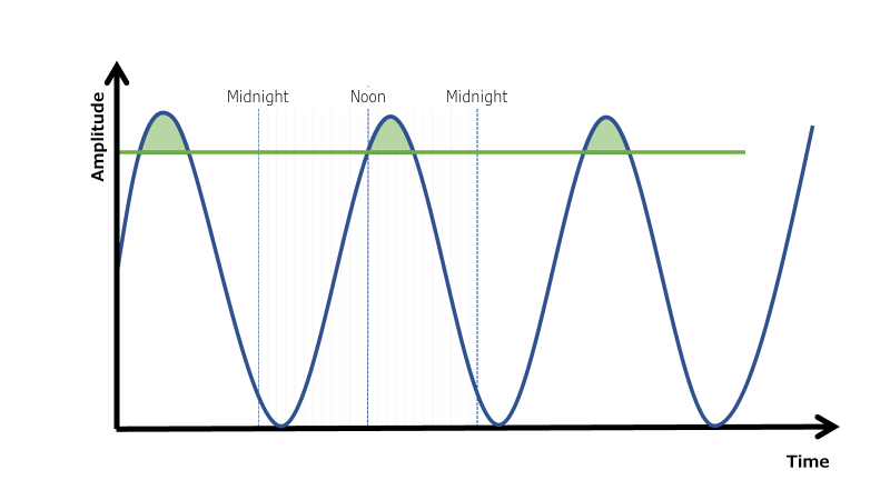 Finally, let’s show time increments by hour, so we now see 24 hours in a day. And we can see that at noon the wave peak rises above the threshold and falls below the threshold again at 5 pm.