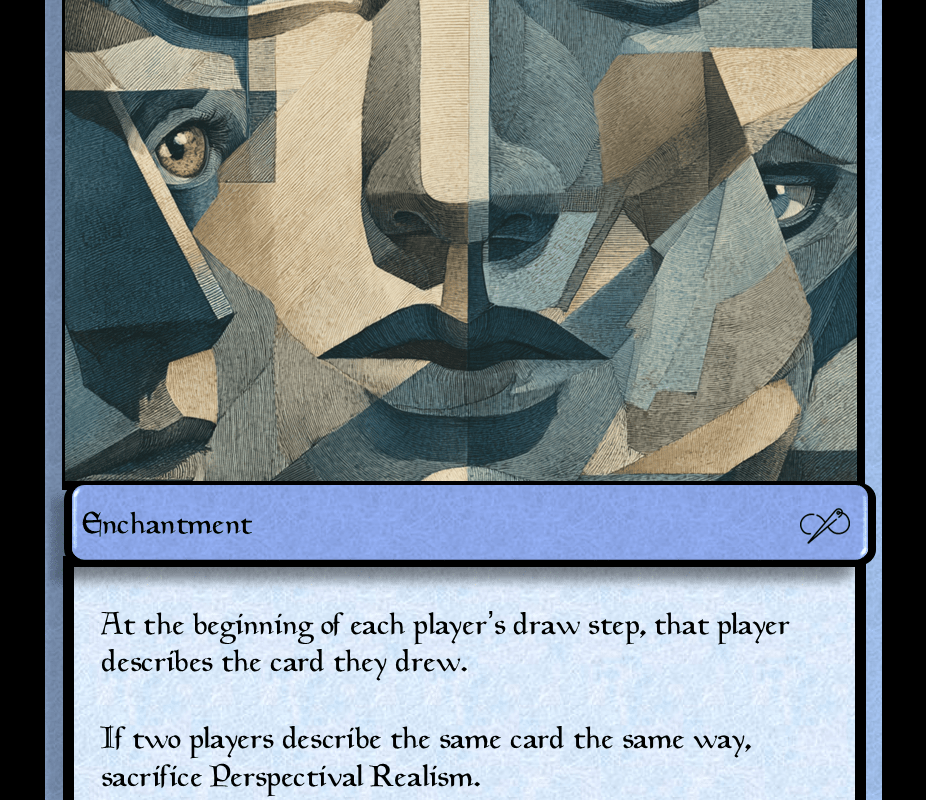 The parody trading card Perspectival Realism was born from that unease. Its mechanic is simple but cruel: at the beginning of each player’s draw step, they must describe the card they drew. The enchantment persists until two players describe a card in the same way—at which point the spell collapses. In other words, consensus kills magic.