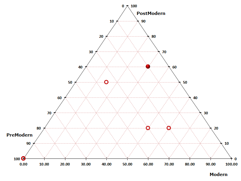 In the accompanying ternary chart, I clumsily place myself where I self-identify, though I could be way off base. As a matter of example, this dot could represent a single dimension as well as some aggregation of dimensions. At the most abstract level, the view should interpret as a person espousing a tendency toward Postmodernism over Modernism fairly far removed from Premodernism. The lower leftmost dot on the Premodern corner could represent a typical pre-Enlightenment peasant as well as a member of some contemporary indigenous tribe such as the Sentinelese.