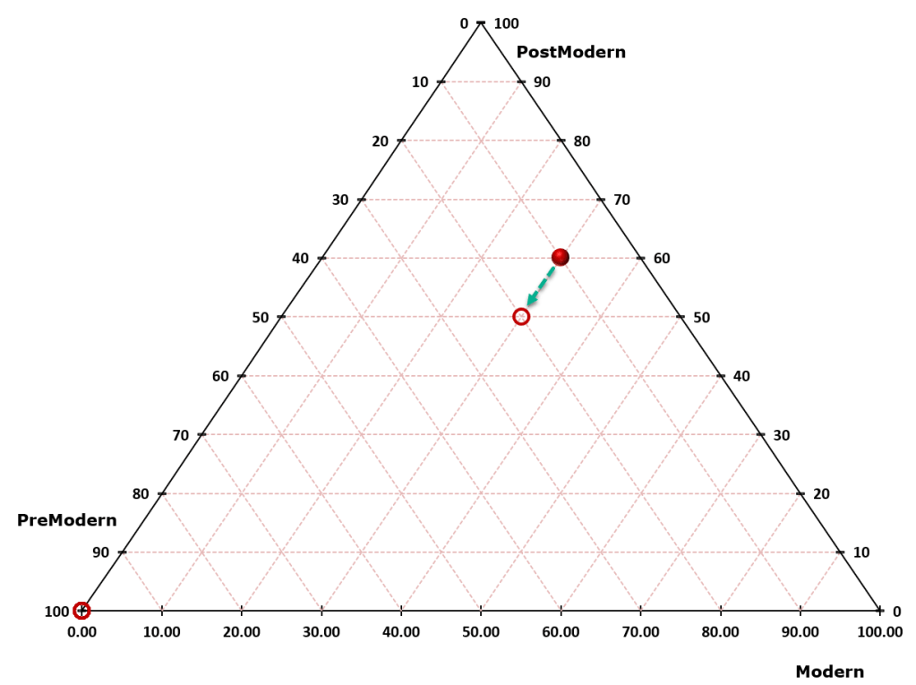 Usign this ternary chart as a reference, if I am the solid red dot at time-1, and adopt some Metamodern world views, my place at time-2 moves in the direction of PreModern, which is to say down and to the left.