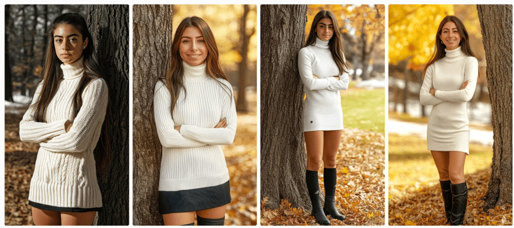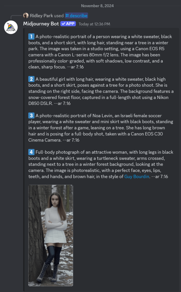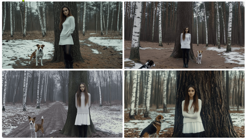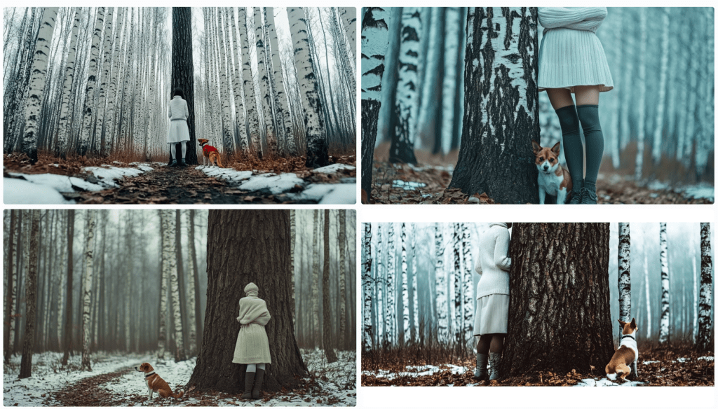 The consensus is that ‘a beautiful girl in a white dress and black boots stands next to a tree’ with a Jack Russell Terrier dog. I see birch trees and snow. It’s overcast. Let’s spend some time trying to reproduce it. To start, I’m consolidating the above descriptions. I notice some elements are missing, but we’ll add them as we try to triangulate to the original image.