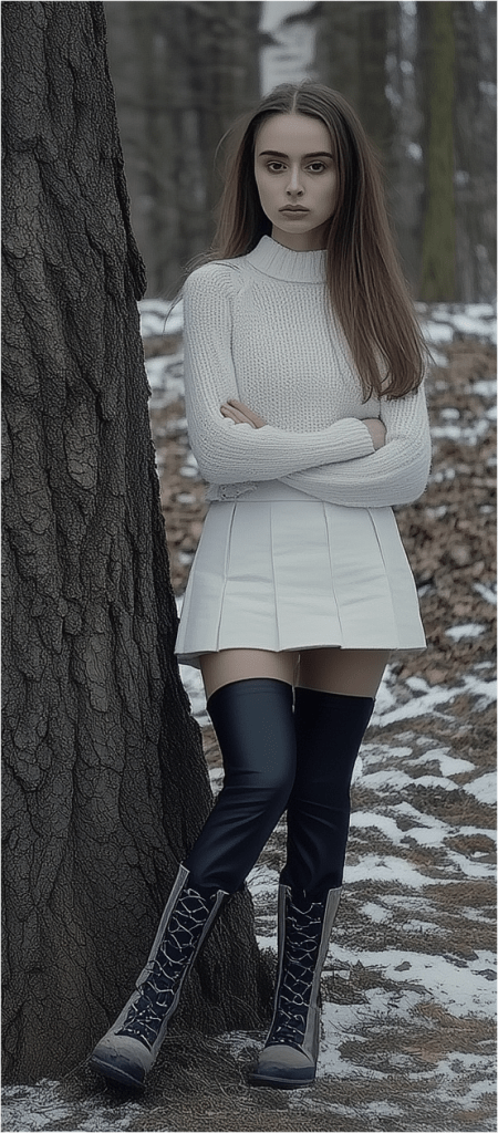 As I regard the image, I’m thinking of a police sketch artist. They get sort of close, don’t they? They’re experts. I’m not confident that I even have the vocabulary to convey accurately what I see. How do I describe her jumper? Is that a turtleneck or a high collar? It appears to be knit. Is is wool or some blend? does that matter for an image? Does this pleated skirt have a particular name or shade of white? It looks as though she’s wearing black leggings – perhaps polyester. And those boots – how to describe them. I’m rerunning just the image above through a describe function to see if I can get any closer.