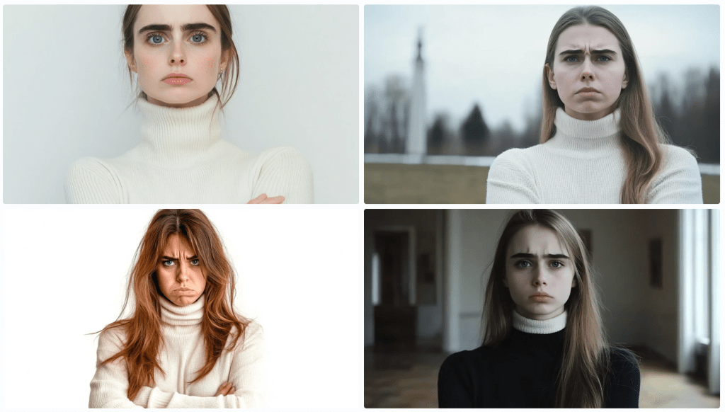 Most apparent is the fact that vampires don’t have a reflection, but that’s not my nit. In the top four images, the reflection is orientated in the same direction as the subject. I’m only pretty sure that’s not how mirrors operate. In row 3, column 1, it may be correct. At least it’s close. In row 3, column 2 (and 4,2), the mirror has a reflection. Might there be another mirror behind the subject reflecting back? It goes off again in 4, 1, first in reflecting two versions of one subject. Also, notice that the subject’s hand, reaching the mirror, is not reflected. The orientation of the eyes is also suspect.