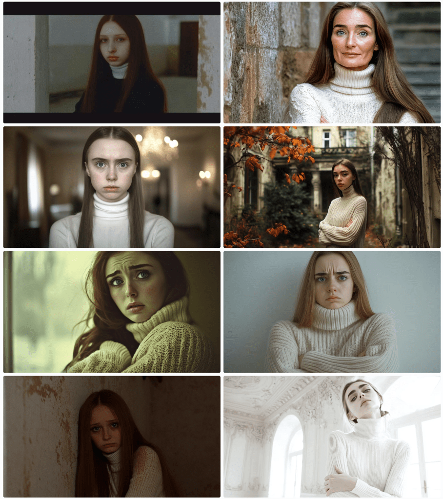 Now, she’s a sad and angry Russian woman with (very) pale skin; large, sad, grey eyes; long, straight brown hair. Filmed in the style of either David LaChapelle or Alini Aenami (apparently misspelt from Alena Aenami). One thinks it was a SnapChat post. I was focusing on her face and hair, but it notices her wearing a white (oversized yet form-fitting) jumper sweater and crossed arms .