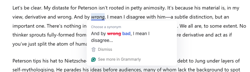This, apparently, was too much for it. The poor dear couldn’t recognise the parallel sentence structure, or the rhetorical flourish at work. No, it suggested replacing wrong with bad. Because why not destroy the symmetry and nuance in one fell swoop?