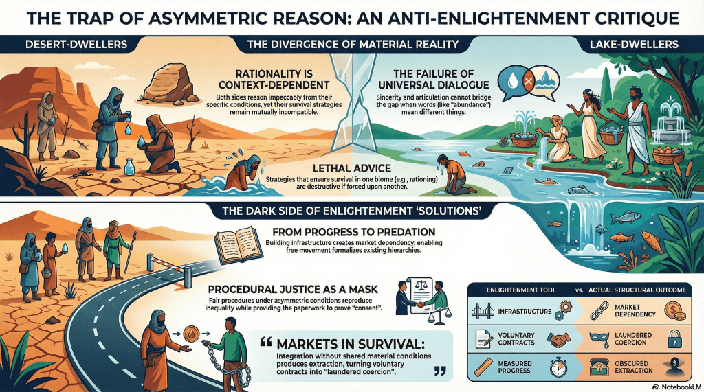 Which is, if anything, more brutal. Because now the desert-dwellers can see what they cannot have. They can stand at the shore, watch the water lap at the sand, understand perfectly well that scarcity is not a universal condition but a local one—