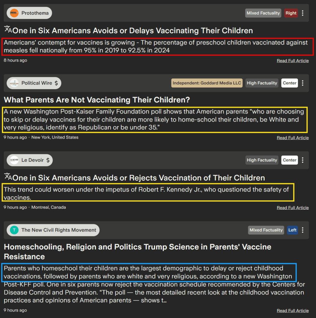 This is the summary view. Scan down, and notice the Left-leaning Raw Story references a ‘staggering number’ of parents who reject vaccines. Notice also how the language softens – the claim is revised to ‘delay or reject’. Without clicking into the story, what is this breakdown? I’m not sure, but this is what sensationalism looks like to attract clicks.