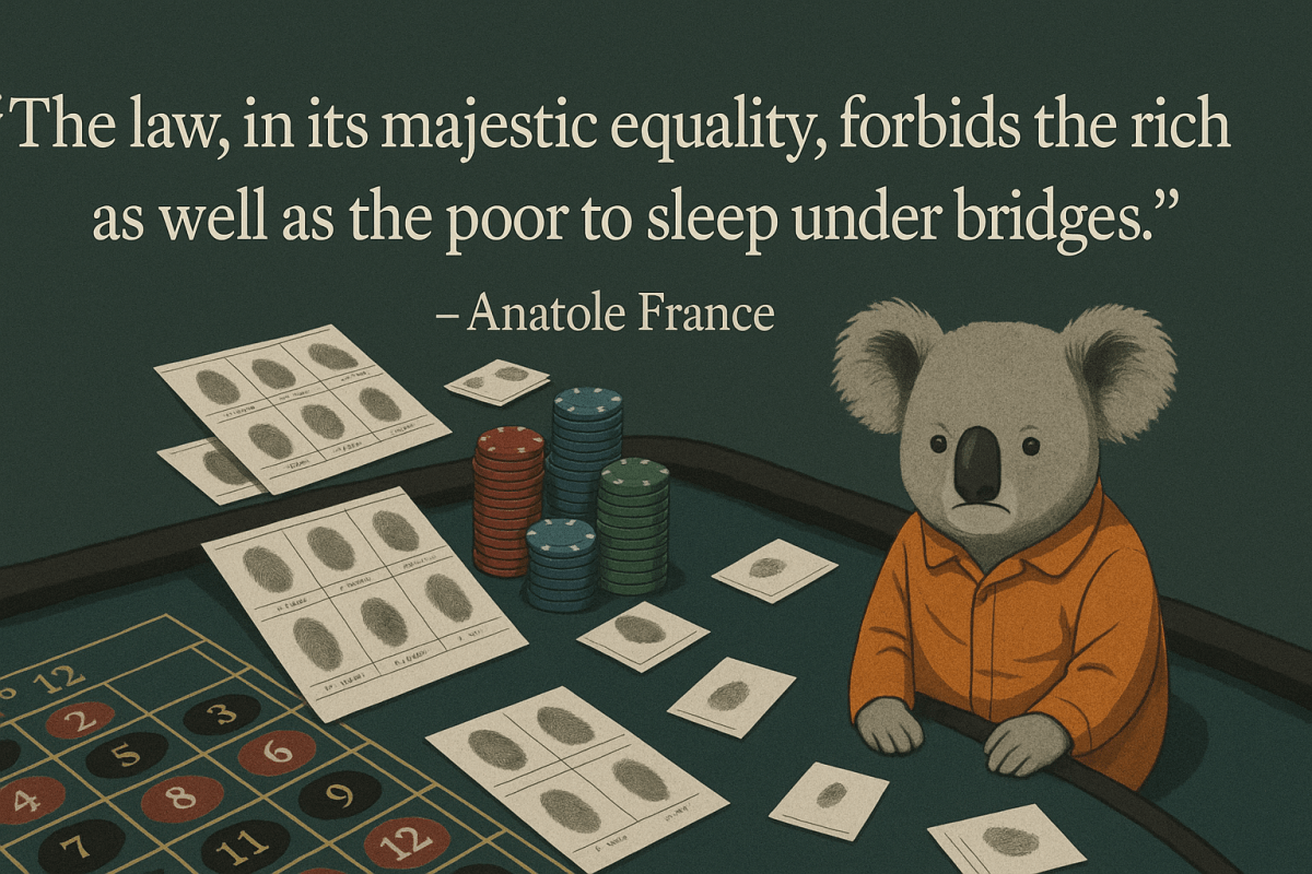 You see, it’s not about justice. It’s about control. Control through performance. The legal system, like a casino, isn’t interested in fairness—it’s interested in outcome. It needs to appear impartial, all robes and solemnity, while tipping the odds ever so slightly, perpetually, in its own favour. This is jurisprudence as stagecraft, science as set-dressing, and truth as a collateral casualty.