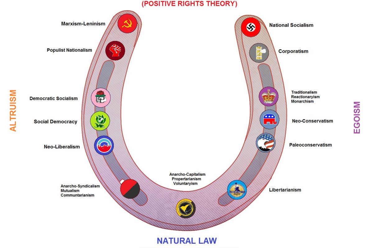 DISCLAIMER: For the record, I don’t endorse the placement of the political ideologies on the horseshoe image, but I find it interesting and it grabbed my attention. I hope it grabbed yours, too.