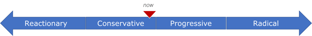 After our conversation, I began researching dimensions established or otherwise proposed by political science. This led me to a place I found interesting—the distinction between radical, progressive, conservative, and reactionary positions. For some reason, this never really occurred to me.